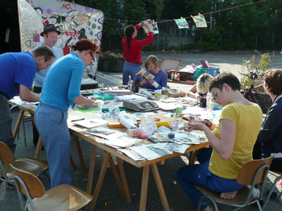 | A collective zine making action. Participants developed individual pages containing visual and written content, which were then compiled in a central pool. Participants then selected individual pages which they which to contribute to, visually, with text or both. When participants felt that a page was towards completion, it was discussed with other members of the group before being hung on a washing line. The action ran over eight hours. !!!Webpage under Construction!!! Webseite befindet sich gerade im Aufbau. Mehr Information und Bilder gibt es bald zu sehen. |